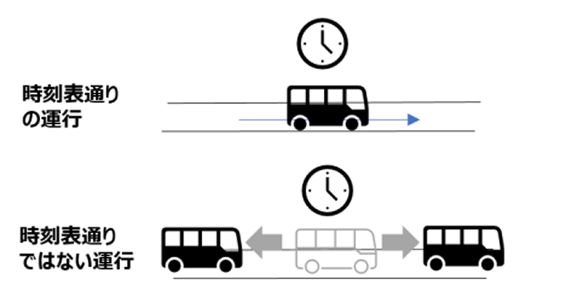 例えば、当初予定に遅れてバスに乗り込んだ人がいるとします。時刻表通りに運行しているバスにこのまま乗り続ければ、確実に遅刻します。しかし、時刻表通りに運行されていない別路線のバスに乗り換えれば、遅刻時間を短縮できる可能性があります。さらに乗り換えのタイミングがうまく合えば、当初の予定通りに到着できる可能性もあります。この場合、バスの乗り換えを検討する人も少なくないのではないでしょうか。
